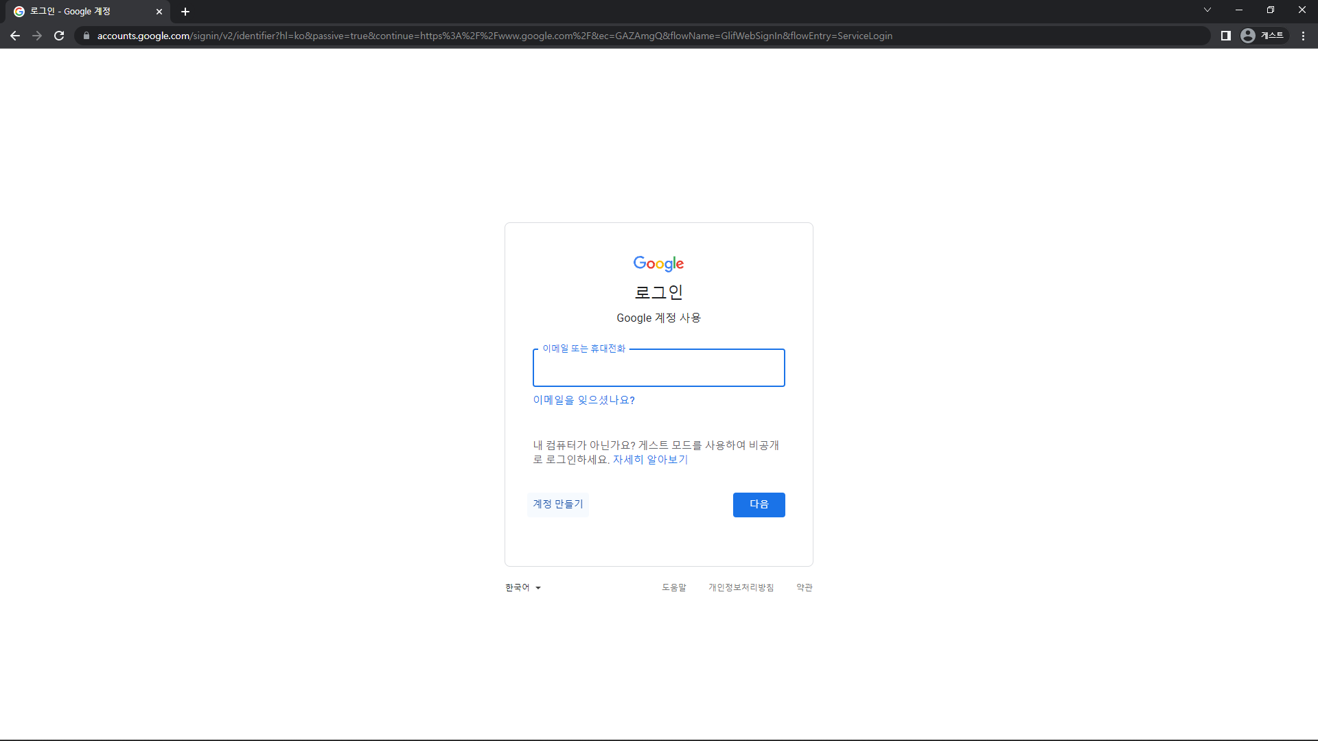 로그인 화면의 비밀번호 아래에 [계정 만들기] 버튼을 클릭하도록 합시다.