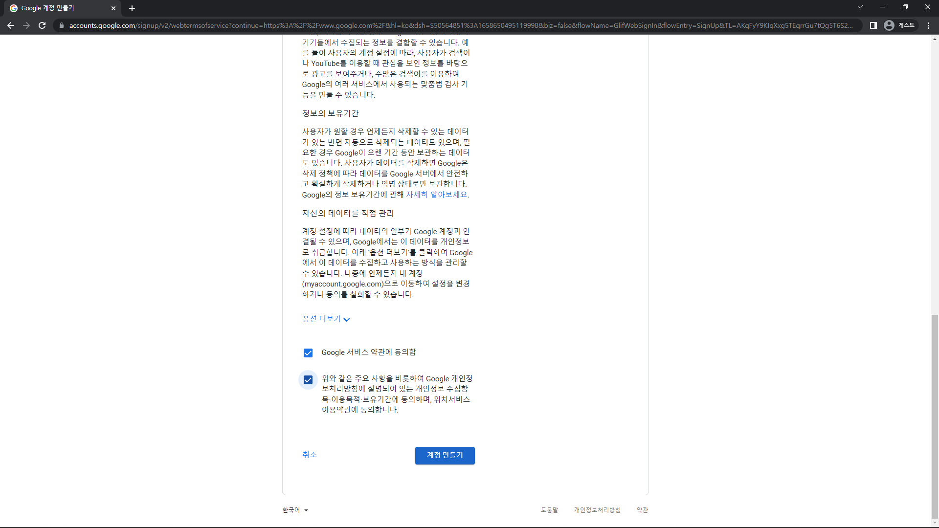 개인 계정 생성에 필요한 약관을 확인 후 최종적으로 계정 만들기를 버튼을 클릭해서 구글 부계정 만들기를 완료합니다.